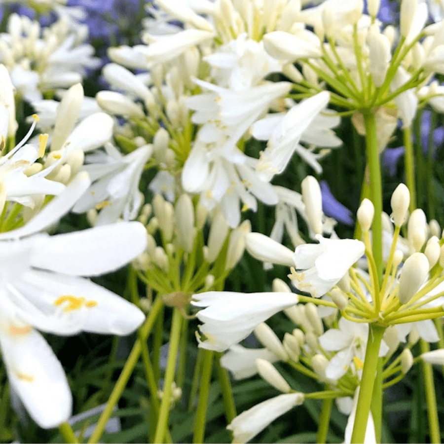 A compact agapanthus with clean, white, trumpet‑shaped flowers held neatly above its foliage. Thrives in full sun or partial shade and is well suited to dry, coastal, or low‑care gardens. Its low seed fertility makes it a responsible, non‑invasive choice for modern landscapes.