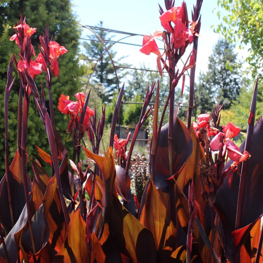 Tropicanna Black is a clump-forming perennial to 1.5m tall with very dark green leaves and stems flushed with very dark purple, almost black. Bright red flowers fading to orange appear from early summer to mid-autumn. Hardy. Height: 1.5m
