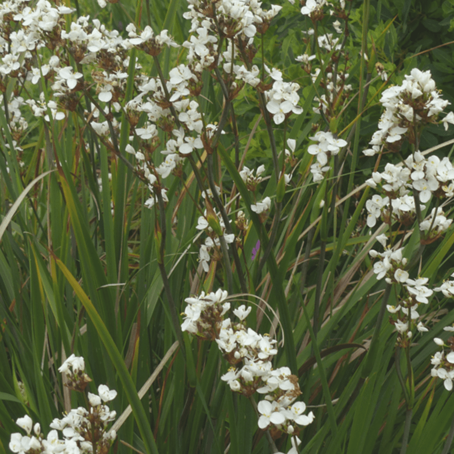 Syn. Libertia chilensis. This attractive, clump forming Libertia produces spikes of pure white iris-like flowers in Spring and Summer. Wide yellowish-green leaves are upright and distinctive. Decorative golden seeds pods last through to Winter. Great for mass planting in sun or semi-shade. Hardy.